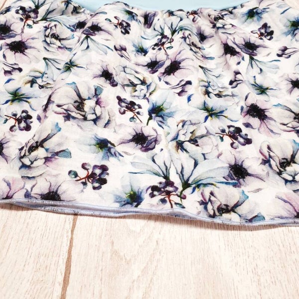 Das Oberteil des Kleides ist aus zweilagigem hellblauen Jersey und der Rock aus Musselin.